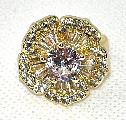 Gold Finish Multi Stone Ring Flower Design with White Cubic Zirconia Polished Golden Tone